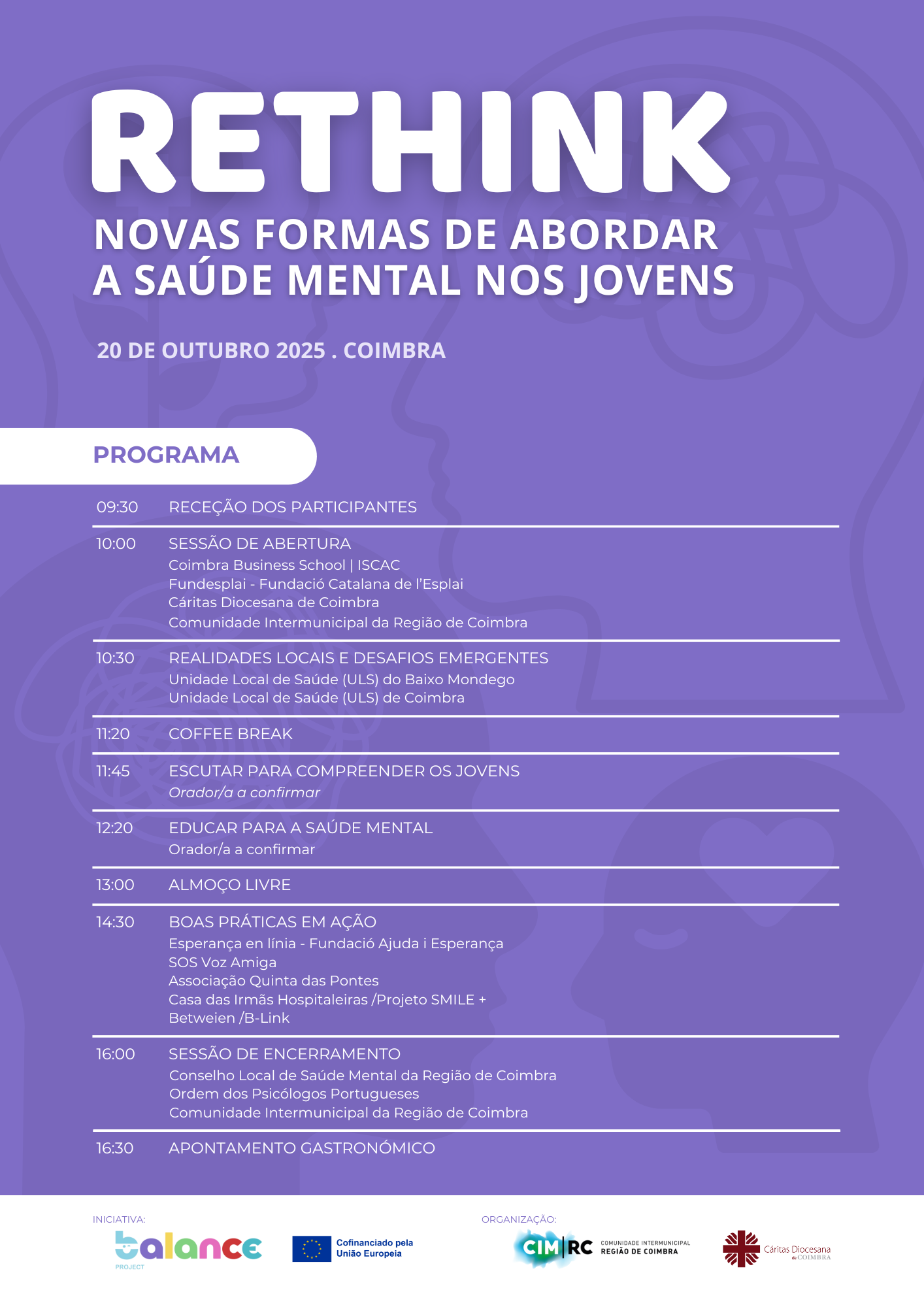 É perante esta realidade que a Comunidade Intermunicipal da Região de Coimbra, em colaboração com outros parceiros, organiza a conferência RETHINK: Novas formas de abordar a saúde mental nos jovens, que terá lugar no próximo dia 20 de outubro de 2025, na Coimbra Business School | ISCAC, em Coimbra.